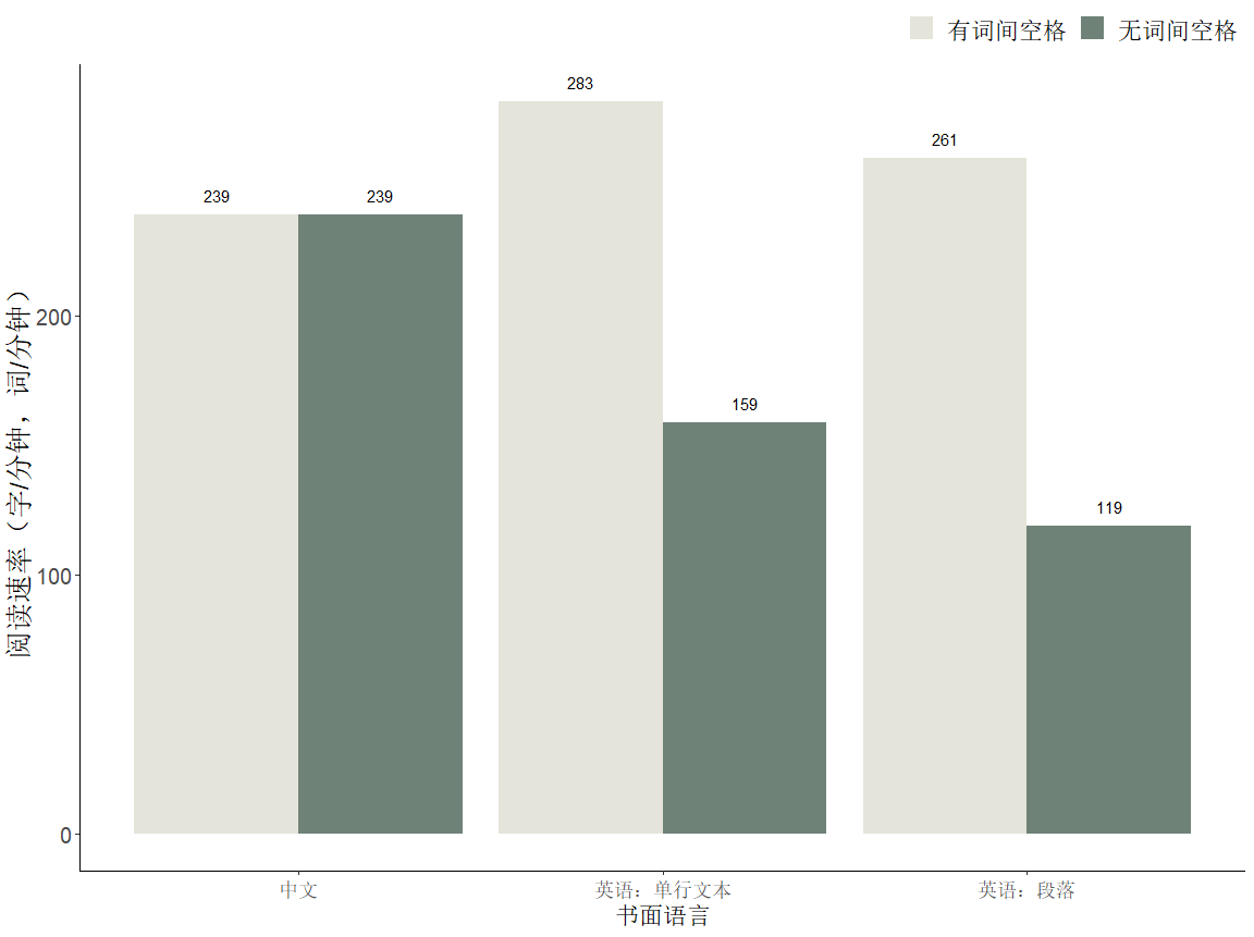 與該研究的假設一致,以往研究表明,改變詞邊界的標記方式對不同語言讀者的閱讀效率產生了不同影響。這些研究發現,在空格信息量較大的書寫系統(如英語)中去掉空格,閱讀速率大幅下降約50%;而在空格信息量較小的書寫系統(如中文),即使插入空格,閱讀速率也不會顯著提升(如圖3所示)。