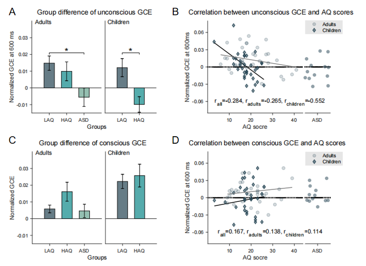 研究者采用這種范式開展的系列實驗結果表明,無意識和有意識的注視線索都可以誘發正常發育成人(20-30歲)和兒童(6-12歲)的注意定向。重要的是,所有正常發育受試者根據無意識注視線索進行注意調節的能力與其自閉特質呈負相關,并且這種能力在患有ASD的成年人和具有高自閉特質的兒童中受損;而在注視線索可見時,沒有觀察到這種關聯性(圖2)。