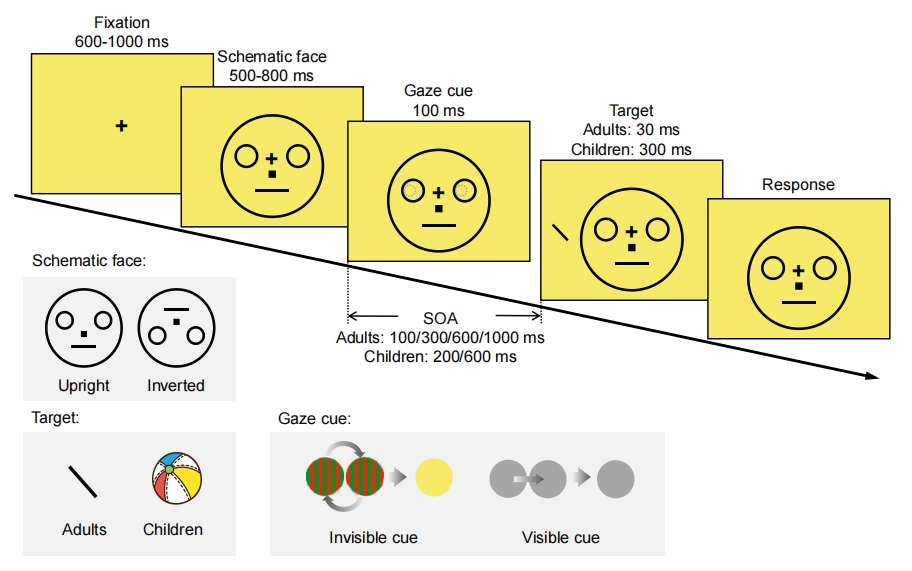 人們常說“眼睛是心靈的窗戶”,因為眼睛能夠傳遞出異常豐富的社交信息。人類對眼睛注視非常敏感,因為它不僅反映了他人的注意方向,還能傳遞動機、情緒、意圖等。當觀察到他人的眼睛注視著某一事物或方向時,人們常常會將自己的注意也轉移到該事物或方向上,這類注意現象被稱為“社會性注意”。已有研究發現,人類嬰兒在大約一歲時就已經發展出這種注意能力,該能力可以預測個人童年期的語言發展和“心理理論”形成,其缺失常與自閉癥譜系障礙(Autism spectrum disorder, ASD)的發生密切相關。