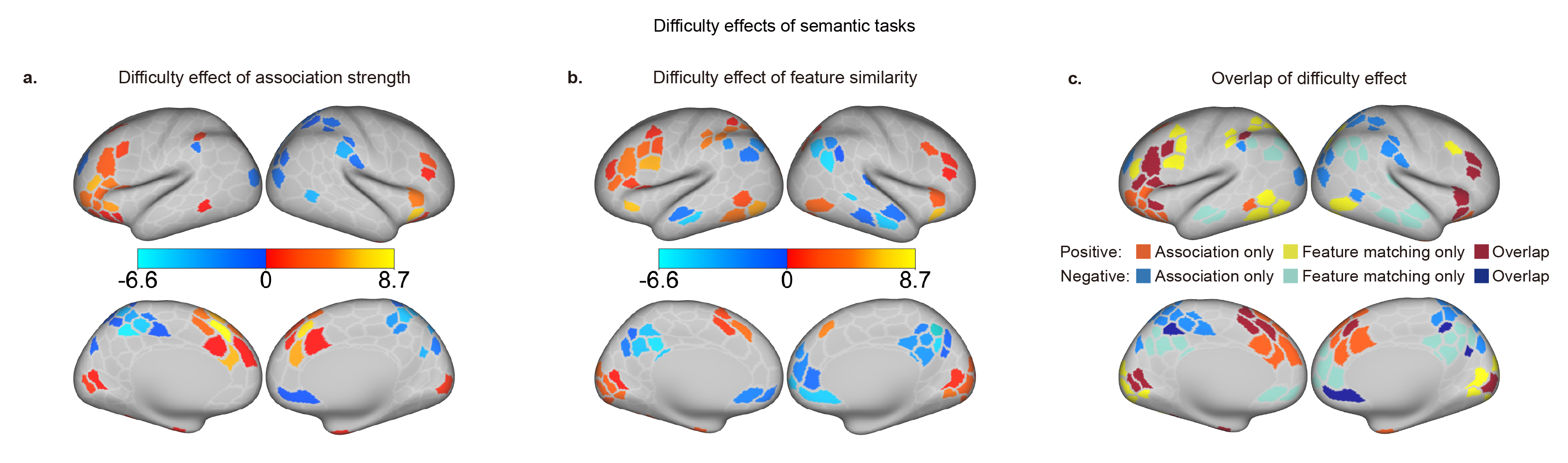 圖1. 語義關聯任務和語義特征匹配任務的難度效應及其比較。更難的語義關聯任務在左側前額葉、內側前額葉、和顳葉前部激活較多,而難度較大的語義特征匹配任務則產生了更多的后部激活。