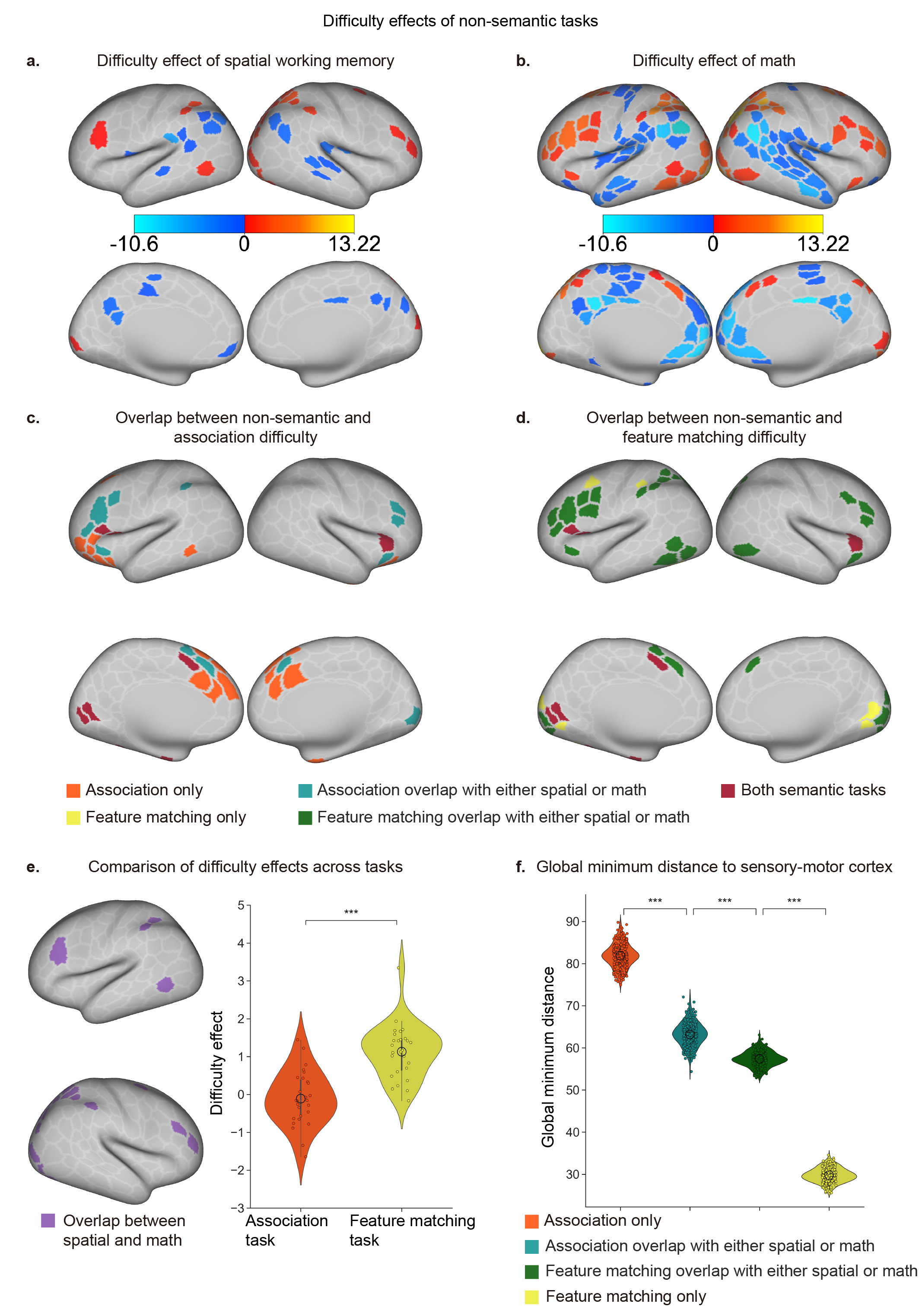 圖2. 語義任務與非語義任務難度效應的重疊以及相關腦區到感知覺皮層的距離。與語義特征匹配任務的難度效應相關的腦區與支持非語義任務的通用控制腦區有更多重疊,距離感覺運動皮層更近。