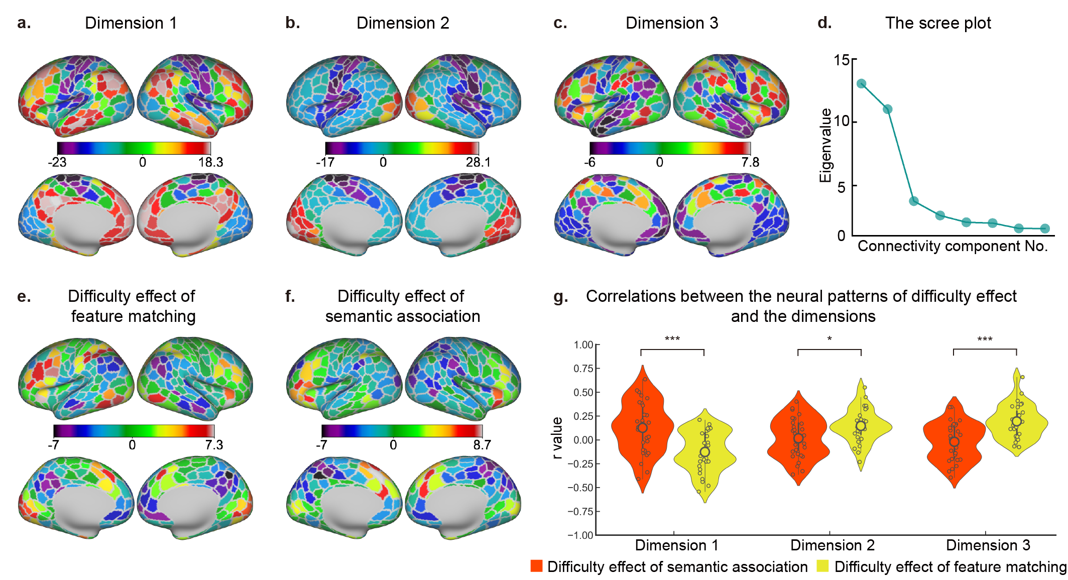 圖3. 語義任務難度效應與內在功能連接的前三個維度之間的空間對應關系。維度一區分感覺運動區域(紫藍)與多模態聯合皮層(紅白)。維度二區分聽覺運動皮層(紫藍)與視覺皮層(紅白)。維度三區分控制網絡(紫藍)與默認模式網絡區域(紅白)。語義關聯任務的難度效應與維度一有更強的相關,而語義特征匹配任務的難度效應與維度三有更強的相關。