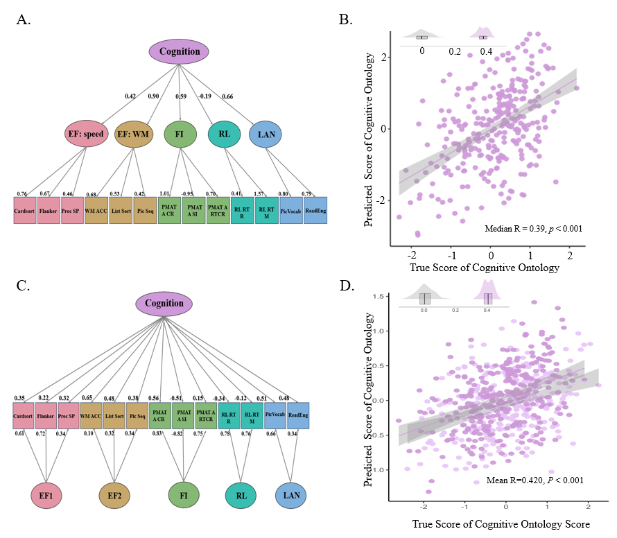 圖1. 高階認知因子可以使用不同結構 (A,C) 的結構方程模型從13個不同認知域的行為學測量中計算得到,但無論是哪種計算方式,都可以使用功能連接得到中等效應量(B,D) 的預測準確率。