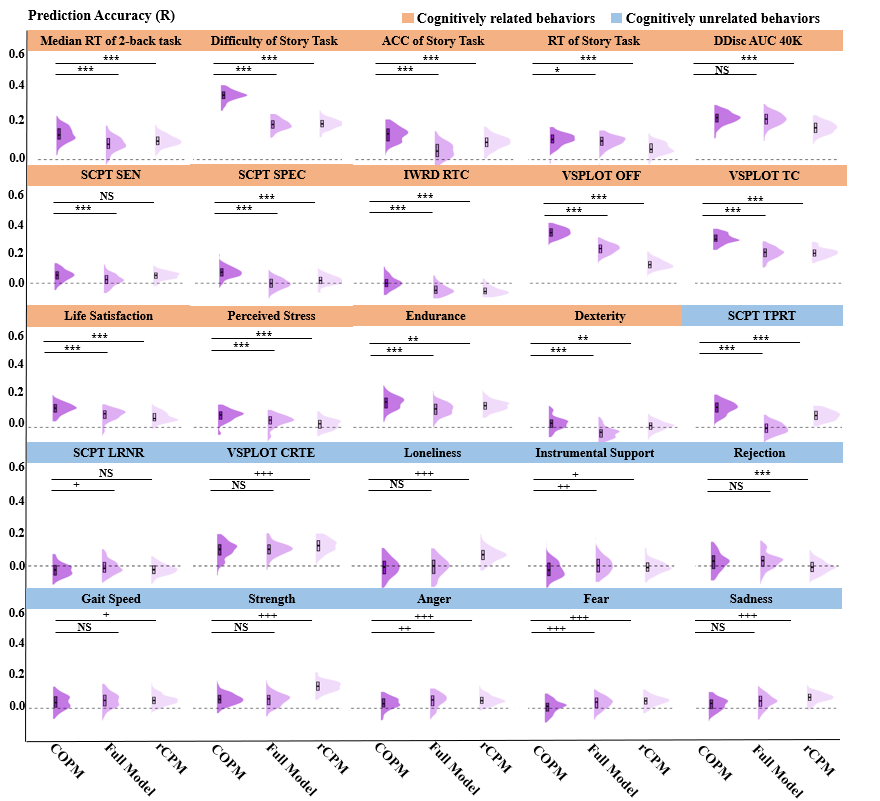 圖2 COPM模型為基于支持高階認知因子的核心腦網絡所構建的預測模型,Full model為全腦功能連接特征模型,rCPM為基于相關性對功能連接作特征篩選的模型。橙色標記的行為任務與認知本體因子顯著相關,而藍色標記的行為任務則與認知功能無關。在所有與認知本子因子顯著相關的任務上,COPM模型都是表現最優的。