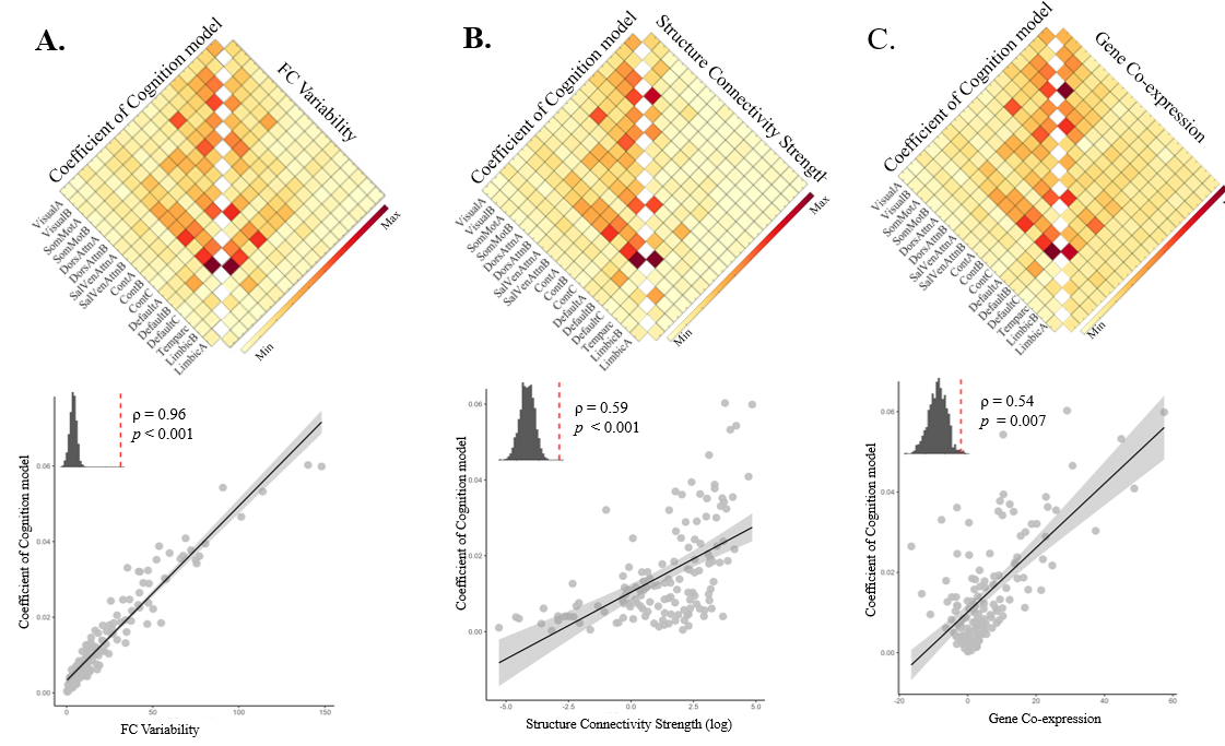 最后,本研究進一步探索了支持廣泛認知功能的腦網絡的結構連接基礎以及該網絡腦區間的基因表達相似性。結果發現,這些關鍵功能連接不僅表現出高度的變異性,還具有明確的結構連接基礎和相似的基因表達模式(見圖3)。這種功能連接的變異性可能反映了大腦的神經適應性和靈活性,有助于應對各種復雜的認知任務。該組網絡主要位于高級聯合皮層,其作為信息整合的樞紐,在復雜認知功能中發揮著關鍵作用,可能是人類認知靈活性的基礎。這組功能連接表現出的強結構連接和相似的基因表達模式,可能提示這組功能網絡具有遺傳基礎,為理解個體間認知能力差異提供了新的視角。