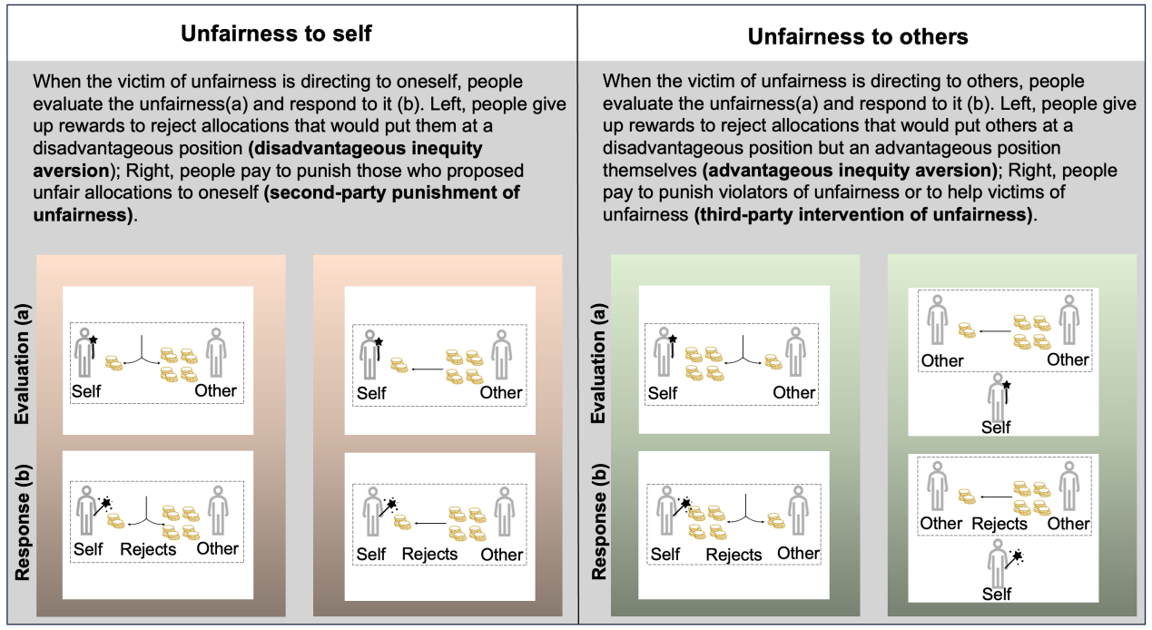 在資源分配情境中,個體對自我和他人的不公平待遇都有著強烈的厭惡(見圖1)。然而,對于這兩種類型的不公平之間的共通性和差異性尚無明確共識。許多神經影像學研究探討了人們在上述兩種情境下如何評價和回應不公平,但這些研究結果的一致性仍有待進一步調查。