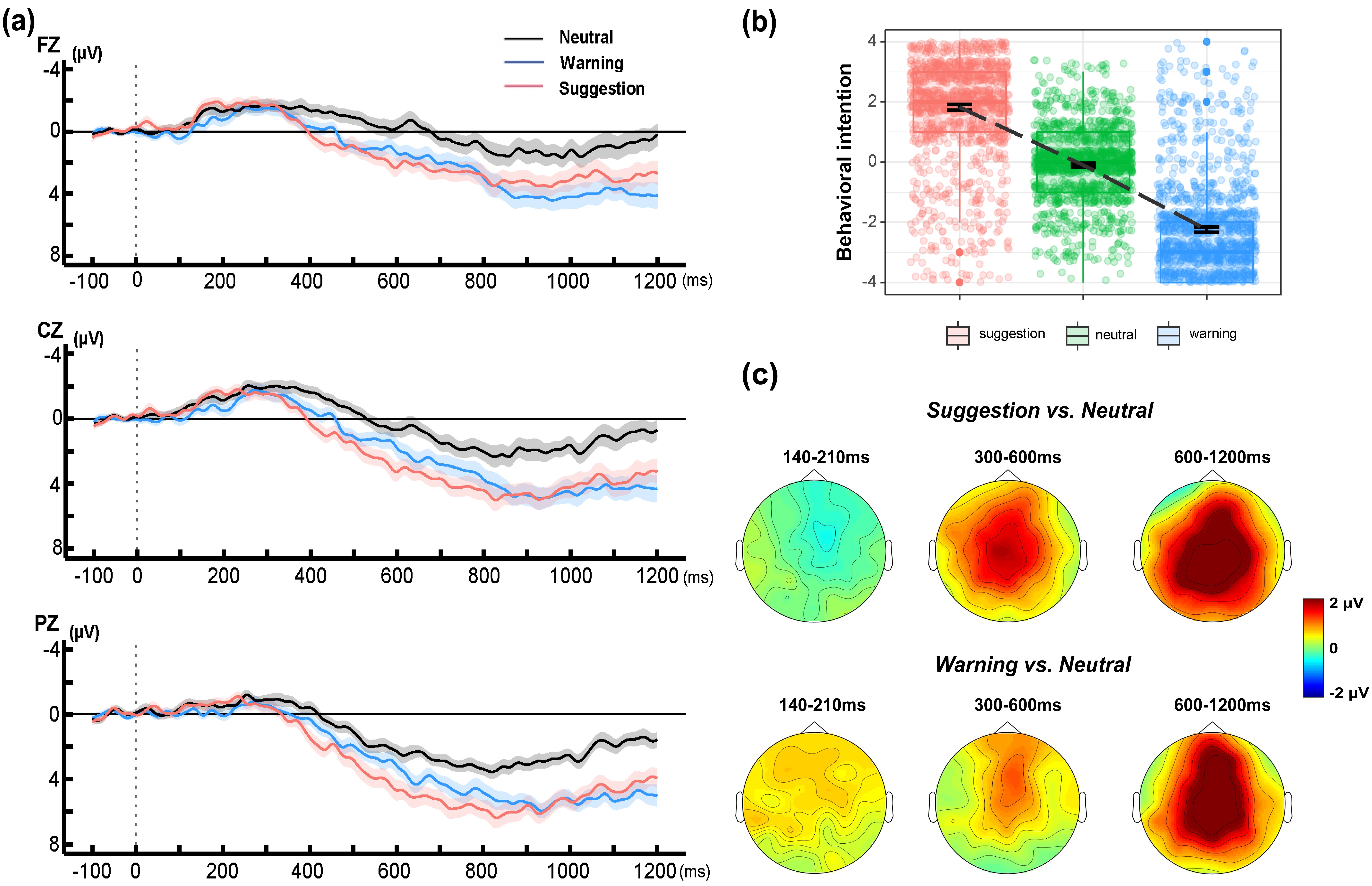 圖2. 建議(suggestion)、警告(warning)和中性(neutral)三個實驗條件誘發ERP活動(鎖時在關鍵詞的起始時間)(a)、ERP效應的頭皮分布(c)、以及意圖行為評價結果(b)。