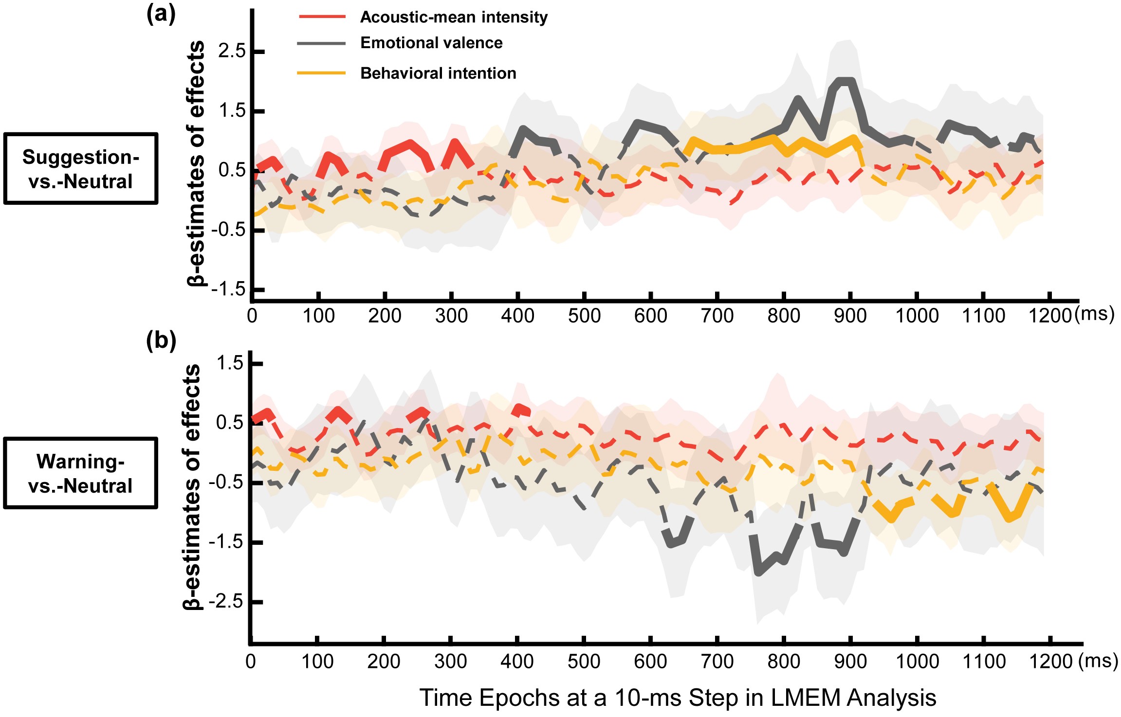 圖3. LMEM分析中,不同時刻的ERP反應與“聲學”、“情感”和“意圖行為評價”的相關關系的效應量(β估計)。實線表示顯著的ERP相關效應,而虛線表示在特定10毫秒時間段內經過FDR校正后不顯著的相關效應。