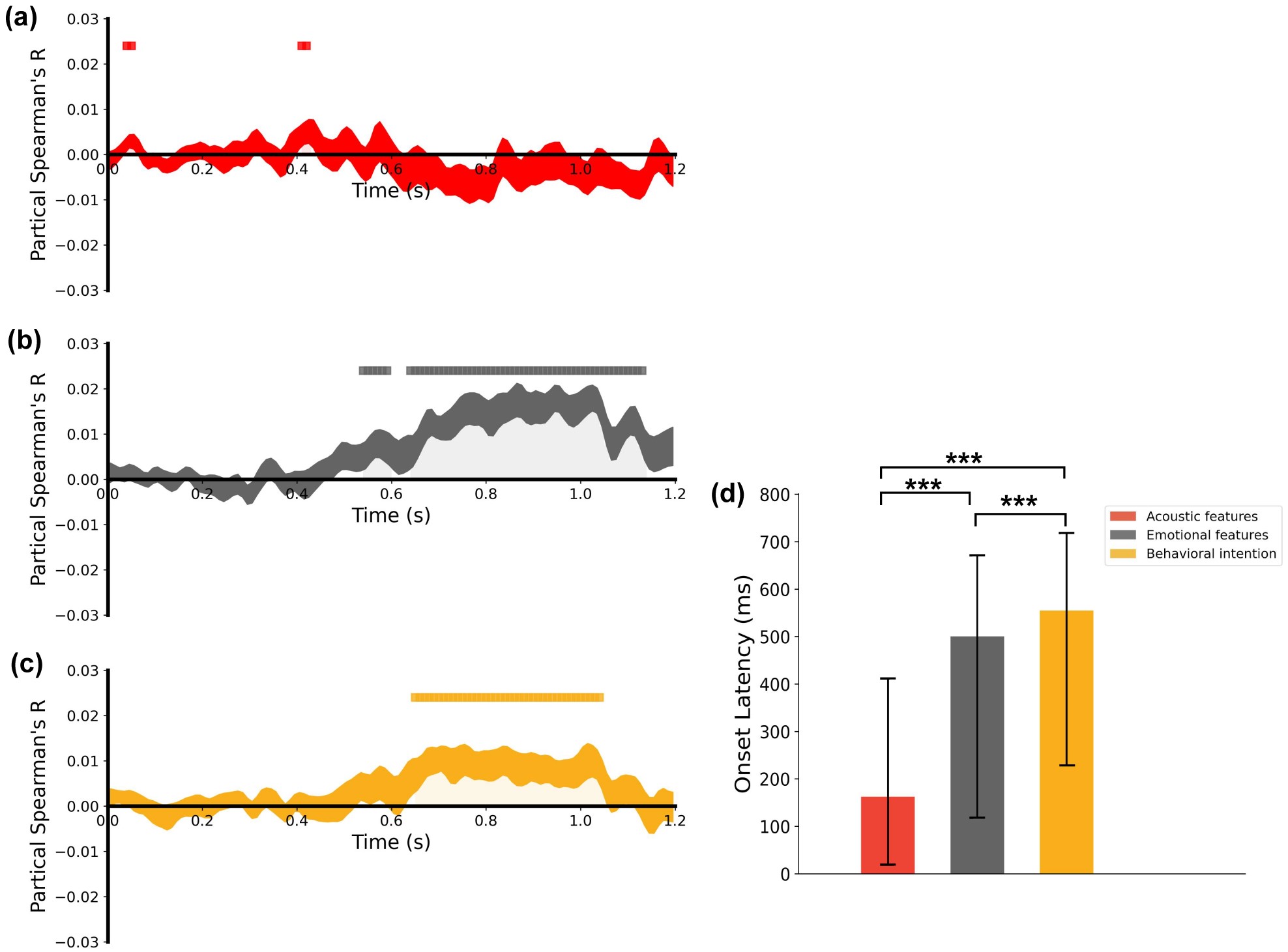 圖4. RSA分析中,神經RDM與聲學(a)、情感(b)和意圖(c) RDM的Spearman相關系數的時間進程。彩色線條和陰影區域表示使用基于簇的置換檢驗(簇定義閾值p < .05和校正后的顯著性水平p < .05)得到的顯著效應。(d) 聲學、情感和意圖相關系數的起始潛伏期(***p < .001)。