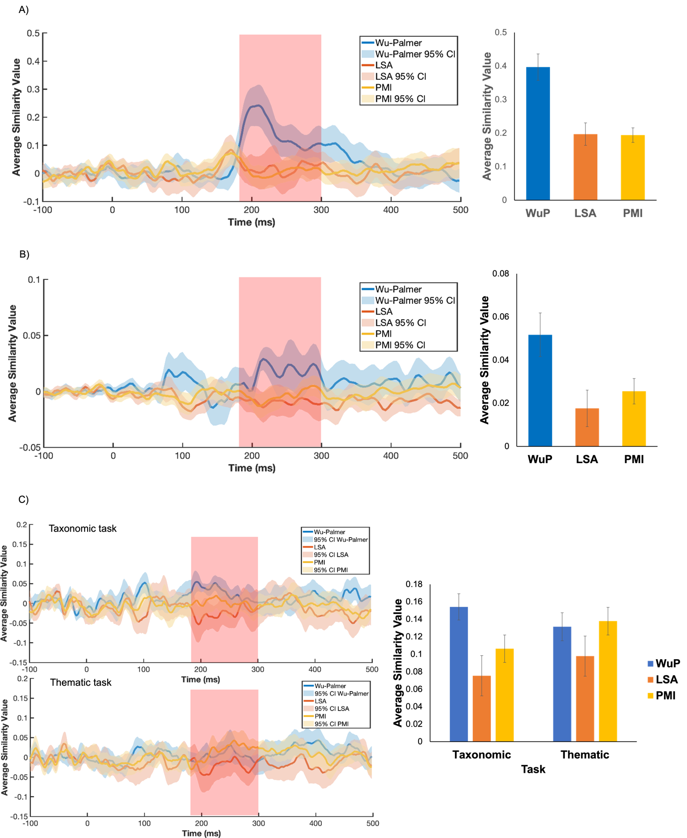 注:圖A、B、C分別展示了不同語境下的腦電表征相似性分析結果(A:范疇關系突出語境,B:無任何語義關系突出語境,C:范疇關系或主題關系突出語境),左側為神經活動與范疇、主題關系計算模型相關度的時間序列,其中標記的時間窗口為180~300毫秒,右側為該時間窗口內神經活動與各個語義計算模型的平均相似度。