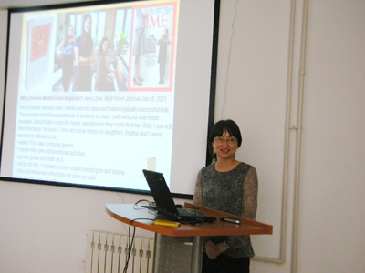 王茜的講座針對“虎媽與孩子的高成就”這個社會熱點問題,通過為期四年的縱向追蹤研究,對比了中美文化環境下父母對孩子的控制程度及其對孩子的學習動機和情緒的影響,研究結果表明,父母對孩子自主決定的鼓勵會提高孩子的學習動機和情緒上的愉快體驗。該研究成果分別發表在2007年和2009年的Child Development雜志上。這是許多家長和教師非常感興趣的話題,報告中,與會老師和研究生與報告人王茜進行了熱烈的討論。