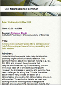 | 5月8日,心理所行為科學重點實驗室李紓研究員應昆士蘭腦科學研究所(Queensland Brain Institute, QBI)邀請,前往澳大利亞參加該所主辦的神經科學研討會(QBI Neuroscience Seminar),并作了題為“風險決策遵循補償性法則嗎?——來自眼動和fMRI研究的匯聚性證據”的主講報告。 | |