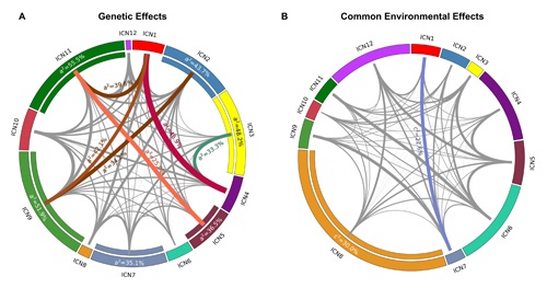 在這項研究中,楊志副研究員等根據最近在畢生樣本上構建的12個常見腦功能網絡(圖1, Yang et al., 2014),系統分析了200對(114對同卵、86對異卵)雙胞胎的上述網絡活動及其相互作用。研究發現,至少6個腦功能網絡顯示出顯著的遺傳特性、1個腦功能網絡體現了顯著的環境可塑性。更有趣的是,研究還發現,不同腦功能網絡間的關聯活動亦具有較高遺傳度(圖2)。這些發現不僅為靜息態功能網絡提供了生物學意義,而且為系統水平上研究腦功能網絡及其行為、心理和疾病的關聯提供了遺傳學基礎。