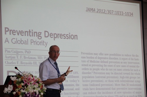 荷蘭自由大學的Pim Cuijpers教授做了題為“老年期抑郁癥的預防:可能與挑戰(Prevention of depressive disorders in old age: Possibilities and Challenges)”的特邀報告。Cuijpers教授多年來致力于老年抑郁研究,被全球著名信息服務提供商湯森路透(Thomson Reuters)評為2014年心理學和精神病領域最具影響力的百名學者之一。Cuijpers教授在報告中分享了老年抑郁干預研究的意義和現狀,并介紹了包括基于網絡手段開展抑郁干預在內的一系列老年人抑郁干預研究進展,他的元分析研究顯示抑郁干預可降低發病率達20-25%。他還指出最適合開展非藥物干預的群體是亞臨床抑郁老人,也就是表現出一定抑郁癥狀但未達到抑郁癥臨床診斷標準的老年人。