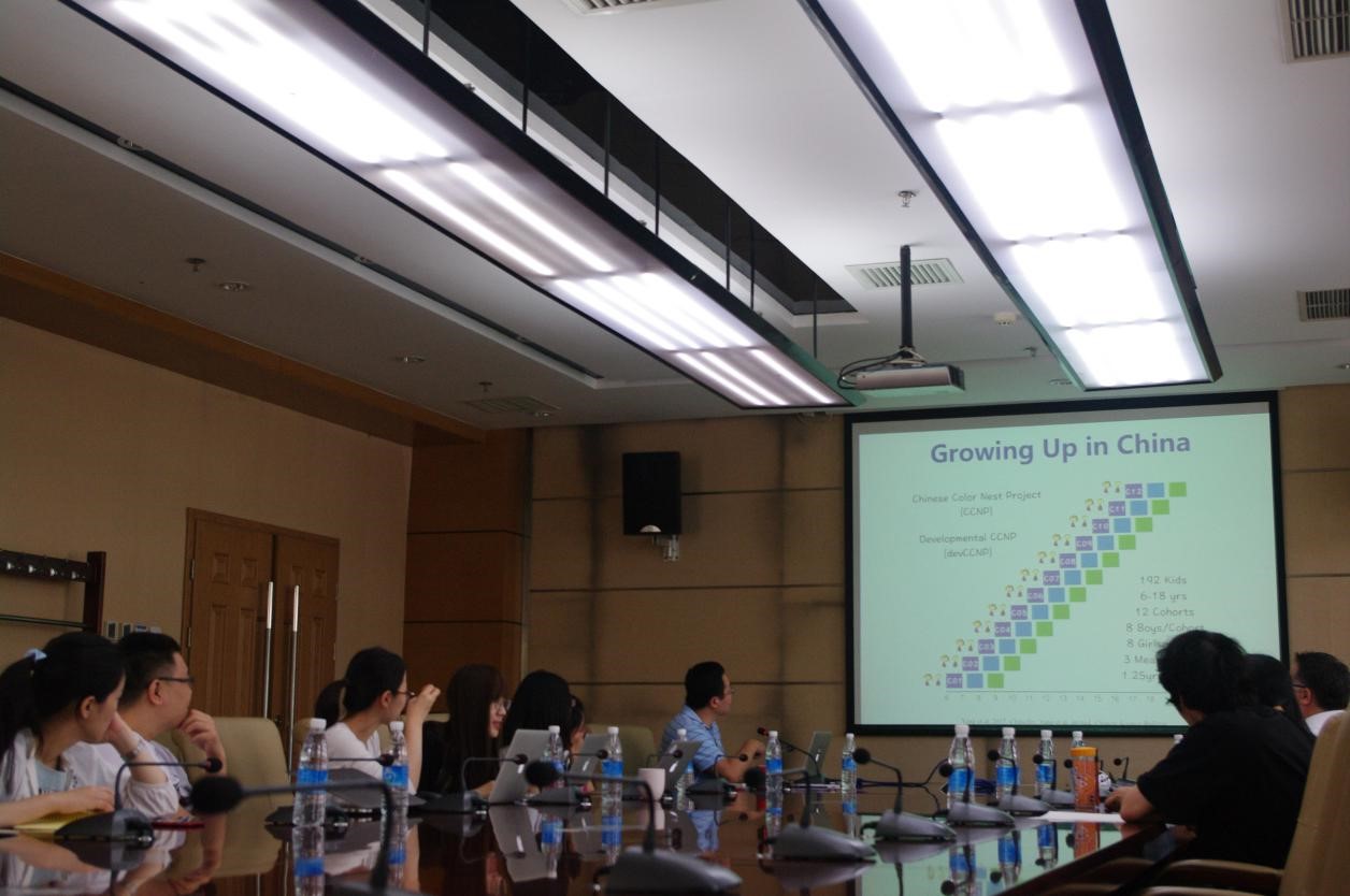 左西年首先介紹了總體項目情況,隨后他帶領的畢生人腦連接組學與行為研究團隊成員詳細介紹了中國兒童腦發育“彩巢計劃”項目的相關情況。“彩巢計劃”是一項旨在繪制中國學齡兒童腦與行為生長曲線的大型實驗項目,項目采用加速縱向實驗設計方法,計劃未來十年內在全國范圍分期分步采集各年齡階段的心理行為與腦樣本數據,建立中國人腦畢生發展的常模軌線。目前,項目已完成重慶市北碚區學齡兒童的數據采集。會議期間,左西年研究組成員詳盡匯報了項目的概況、實驗設計、實驗方法與材料、實驗進展等。Beckmann對“彩巢計劃”表示肯定與贊賞,也對項目提出了寶貴意見。