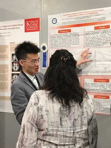 陳楚僑研究員還帶領來自認知神經科學實驗室、香港中文大學與上海精神衛生中心等單位的其他成員與學生在會上做了一系列研究展示,包括由陳楚僑研究員代碩士研究生周晗昱所展示的青年雙生子群體的社會不信任研究,王毅副研究員報告的分裂型特質人群的面孔識別研究,上海精神衛生中心碩士研究生儲敏怡報告的住院精神分裂癥患者的快感缺乏研究。