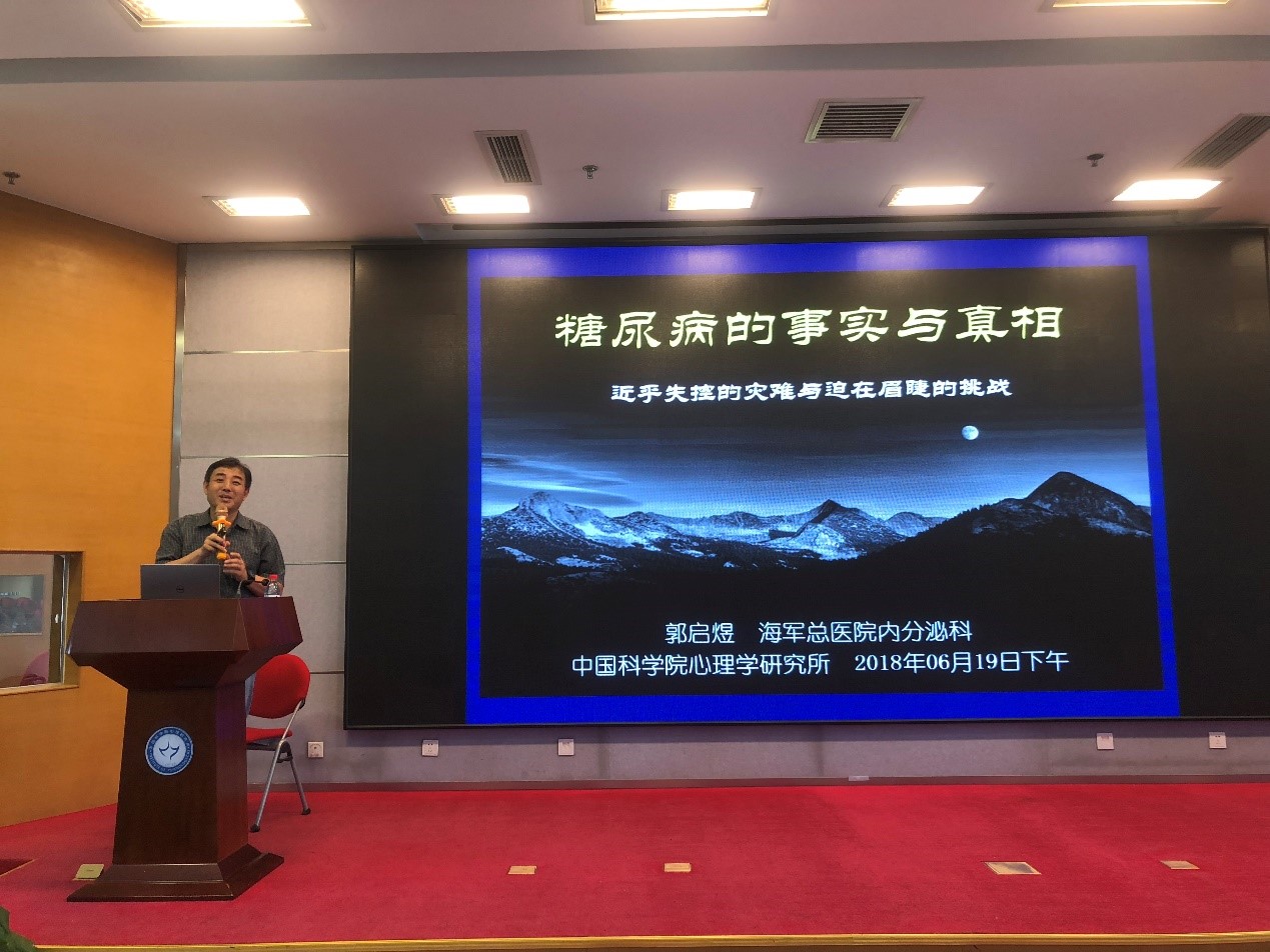 6月19日下午兩點,“糖尿病的事實與真相” 健康教育講座在心理所九層會議室舉辦。講座邀請了海軍總醫院內分泌科的主任醫師郭啟煜教授講解糖尿病的相關問題。郭啟煜教授是中國老年保健協會糖尿病專業委員會副主任委員、中國醫促會糖尿病教育與管理分會副主任委員、中華糖尿病協會副會長,現任十余種雜志編委,發表專業學術論文與科普文章200余篇,參編專著7部,多次榮獲軍隊科技進步獎和醫療成果獎。