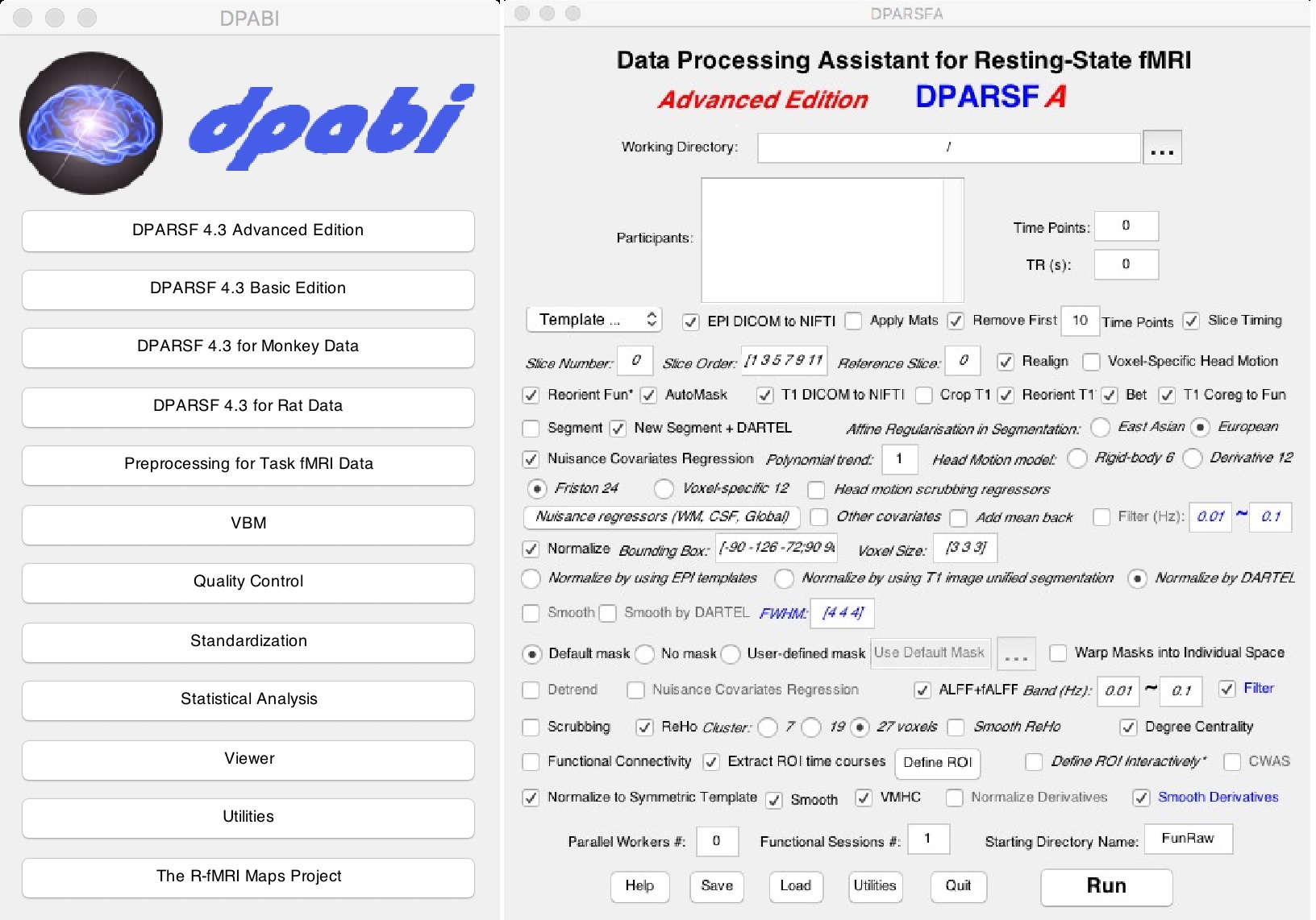 DPABI(腦成像數據分析平臺,Data Processing & Analysis for (Resting-State) Brain Imaging)是在靜息態功能磁共振流水線式數據處理軟件DPARSF(Data Processing Assistant for Resting-State fMRI)基礎上開發的一站式腦功能成像數據處理平臺。該工具包融入了頭動控制、噪聲去除、數據標準化等方面的最新研究進展,強調了重測信度和質量控制在腦影像數據處理中的影響,為動物數據(如大鼠和非人類靈長類動物)的靜息態功能磁共振數據提供了用戶友好的流水線數據處理工具。其中,作為DPABI核心組件的DPARSF經過持續不斷的更新升級,已經成為領域內廣受歡迎的流水線式靜息態數據處理平臺之一。用戶可以從掃描儀原始數據開始,通過申請人團隊開發的一站式解決方案,計算出最后的靜息態功能指標。DPARSF大大降低了靜息態功能磁共振數據處理的門檻,研究者不需要深刻理解每一個預處理步驟的實施細節,也不需要進行繁瑣耗時且易出錯的手工操作,更無需熟練的編程技巧。DPARSF尤其適合于臨床醫生,以及機器學習等其他領域的研究者,快速地將靜息態功能磁共振成像應用于其所關心的科學問題,而不必糾結于數據預處理的繁瑣細節。