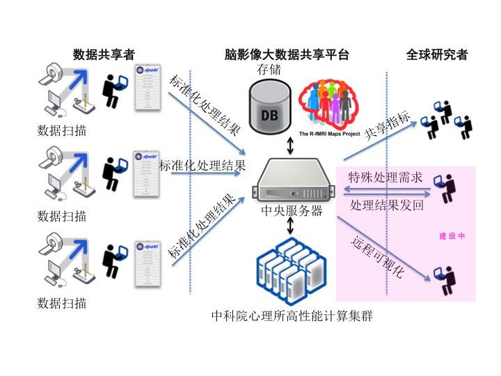 近期,嚴超贛在DPABI/DPARSF標準化計算平臺的基礎上建設了靜息態腦影像大數據共享平臺(The R-fMRI Maps Project, http://rfmri.org/maps),與全球用戶共同累積正常人與多種腦疾病的靜息態功能磁共振數據處理指標。DPABI包含了使用簡單、界面友好的數據處理、整理和上傳模塊,研究者可以很方便地上傳被試的標準化數據處理指標,避免了上傳原始數據的種種弊端。另外,精心挑選的數據指標而不是龐雜的原始數據,更能促進科學共同體的廣泛參與,充分利用各自學科的優勢,探索精神疾病診斷治療。基于公開數據,平臺已經共享了4702名被試靜息態影像數據,已有1000余名研究者下載該數據用于研究。