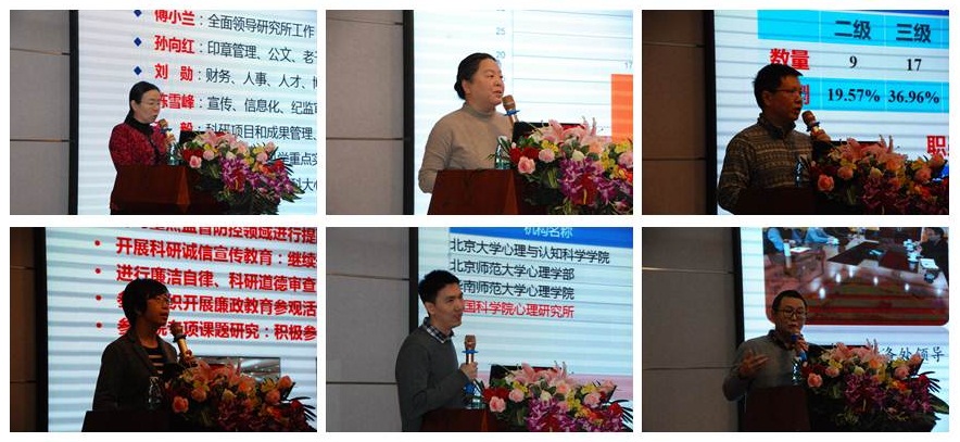 心理所副所長劉勛以《引育俊才強隊伍 開源節流所興旺》為題,對人事、財務、繼續教育方面的工作進行總結和部署。心理所黨委副書記、紀委書記、副所長陳雪峰對其分管的紀監審、宣傳、信息化、等工作進行總結,并闡述了2019年的工作思路。