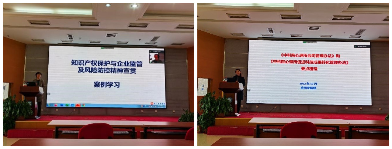 隨后,應用發展部主任張莉對《中國科學院心理研究所合同管理辦法》和《中國科學院心理研究所促進科技成果轉化管理辦法》進行了宣講,重點解讀了兩個管理辦法制定的背景、相關工作要求及辦事流程。