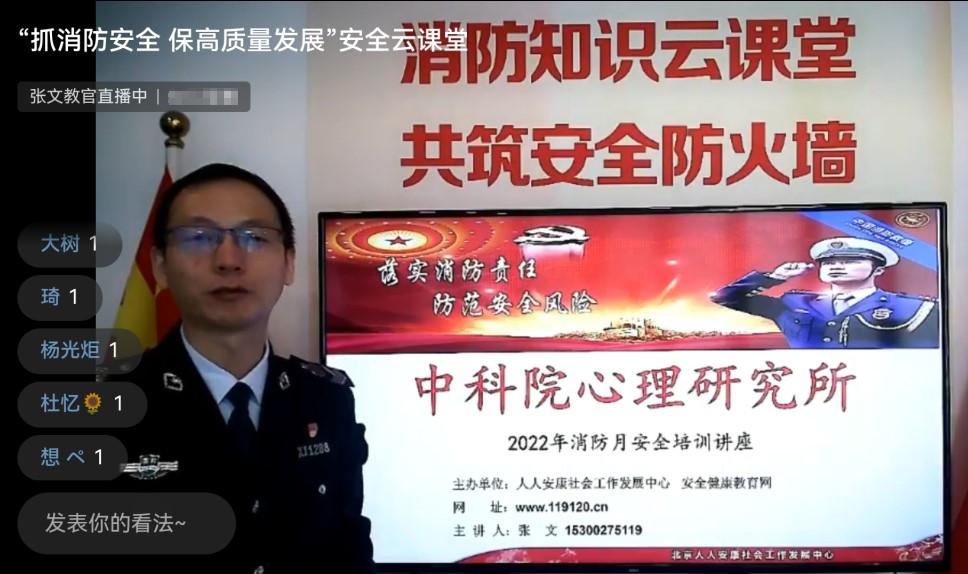在上午的活動中,綜合辦公室邀請了人人安康社會工作發展中心的公益宣講員張文教官作“抓消防安全 保高質量發展”專題報告。報告以線上直播的方式進行,全所百余名師生在線觀看學習。張文用通俗易懂的語言和生動鮮活的案例向大家講解了辦公場所、家庭、高層建筑、廚房、電動車等安全隱患和消防裝備的使用等知識,并結合親身經歷和消防器材進一步講授了預防火災的基本常識和滅火撲救及逃生的方法。報告最后,張文就大家線上提出的問題進行了回應。