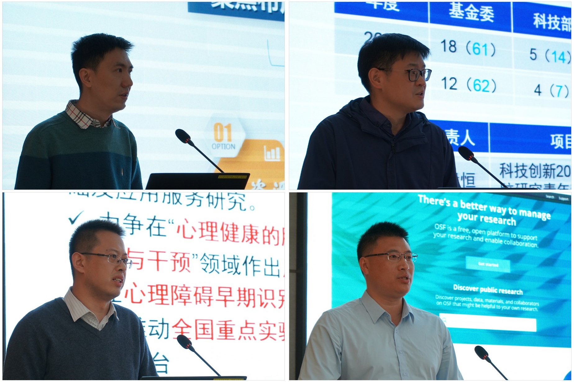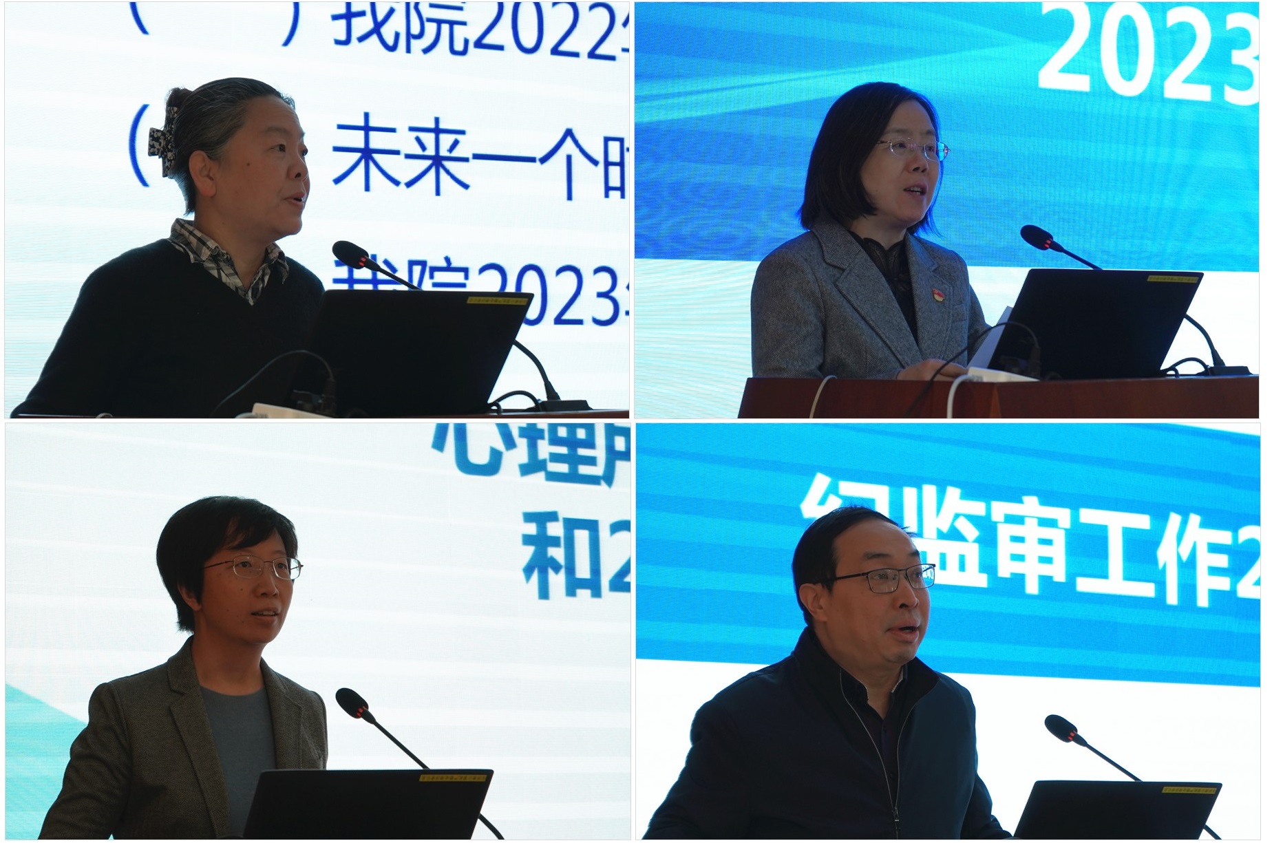 心理所所務委員蔣毅、胡理、王亮、嚴超贛分別簡要匯報了各自協管的人事人才、科教融合、國重申建、科研項目管理、科技創新規劃、公共科學研究平臺、國際交流、科學數據管理、學會期刊、信息化和宣傳等工作的進展情況和2023年工作計劃。